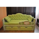 Отличительной особенностью данной модели является комбинация материалов: ЛДСП, ткани флок и ламинированной наклейки. Все материалы сертифицированы. Фасад выдвижного ящика для белья обит тканью, спинка и подлокотники мягкие, что создаёт ощущение комфорта. Также из материала флок сшиты подушки и наматрасник, их можно приобрести отдельно. Благодаря широкой цветовой гамме, покупатель сам может выбрать интересующий его цвет, который более подходит мальчику или девочке и вписывается в интерьер комнаты.